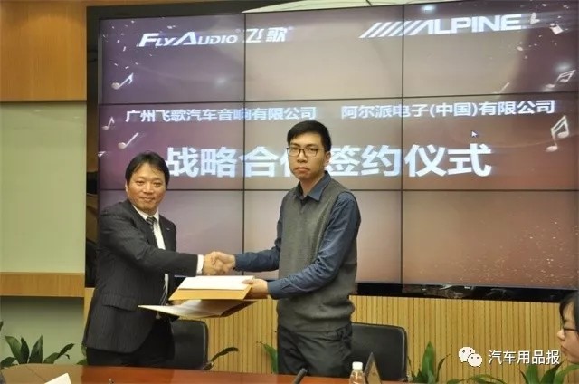 2017年12月28日下午3点整,广州飞歌汽车音响有限公司与阿尔派电子(中国)有限公司强强联手,双方达成合作意愿,共同举办联合签约会。阿尔派电子(中国)有限公司品牌事业部部长幸田刚、副部长吕明刚,阿尔派电子(中国)有限公司潘志滨,飞歌后装事业部总经理梁泽源、销售总监朱冠西,品牌经理赵之桔以及行业媒体嘉宾出席此次签约会。《汽车用品报》作现场报道。