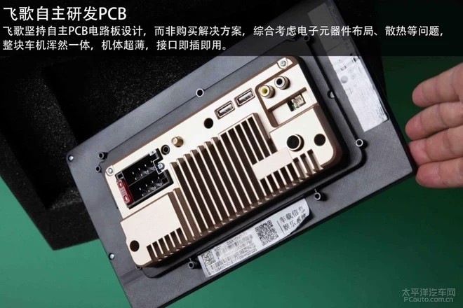 翻过来看到同样简洁的主机背部,只有一个总线接口,安装直接用连接线束和原车预留接口对插即可。飞歌自主研发设计的PCB电路板被严丝合缝的包裹在模具和用料同样细腻的盖板下,整体感觉轻薄可靠。