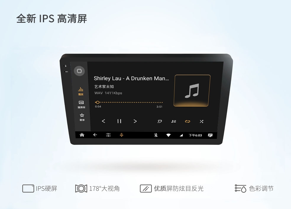 升级全新9 英寸/10.1 英寸IPS高清钢化屏,1024×600分辨率,支持MiraVision色彩调节功能,画显真实生动。透光率高,操控手感顺滑,更广的可视角度让车内观感更好,带给用户更好的品质体验。