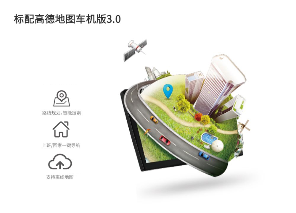 标配高德地图车机版, 专业级GPS定位精度范围<5m,导航信号更强,路线更精确。支持路况查询,躲避拥堵;路线智能规划,多策略多路线目的地推送;高德地图免费升级、离线地图等让你出行方便省心。