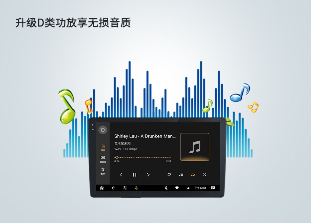 4×50W输出功率,升级D类功放,任意切换个性音乐风格,给你独特的享受。此外,支持多种音乐软件安装,音乐随时播放;支持无损音乐格式,畅享无损音质。