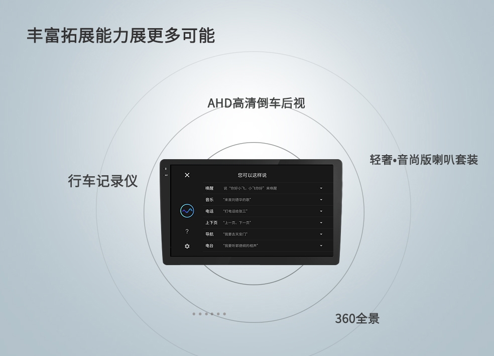 更多拓展功能,满足不同需求。行车记录仪、AHD高清倒车后视、360全景、轻奢音尚版喇叭套装等,让行车不仅安全,更加趣味横生!