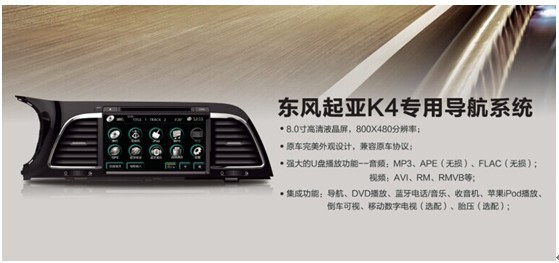 只为赋予驾驶之外的更多乐趣,是飞歌一直以来的信条。东风起亚K4飞歌专用导航,独具8寸高清液晶屏,800*480的分辨率;强大的U盘播放功能,音频视频格式随君选择——MP3/APE(无损)/FLAC(无损)、AVI/RM/RMVB···无损音乐播放,为您带来纯净的影音体验,行车路上拥有更多乐趣。
