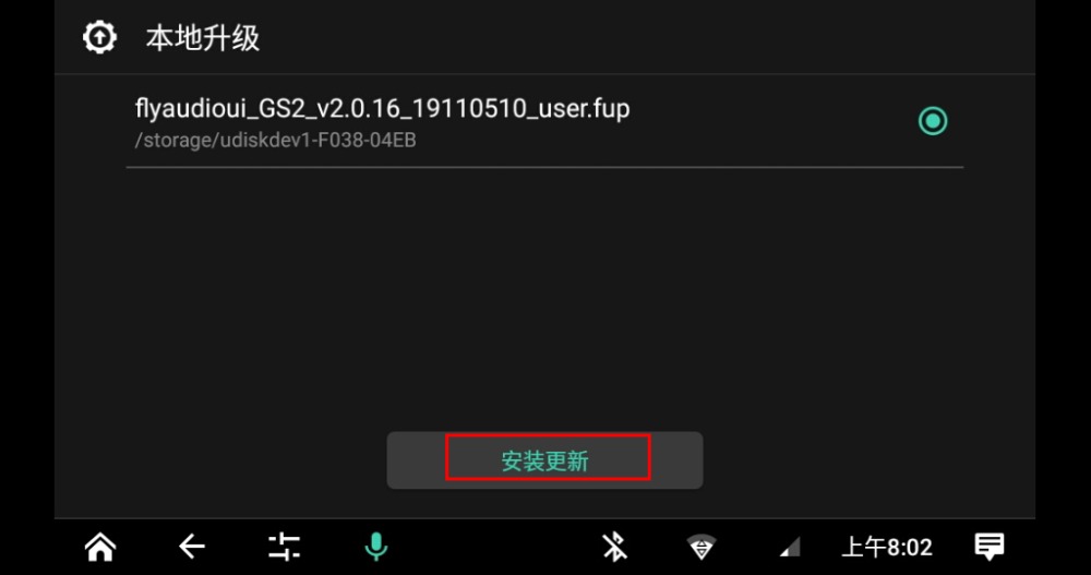 选择升级包,点击“安装更新”,车机即可进行升级,升级期间车机会重启,切勿切断电源!