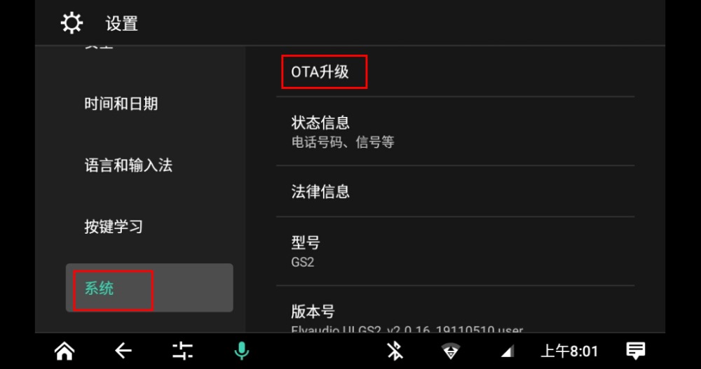 车机升级至2.0版本后,即可支持OTA升级。点击车机“设置”-“系统”-“OTA升级”。