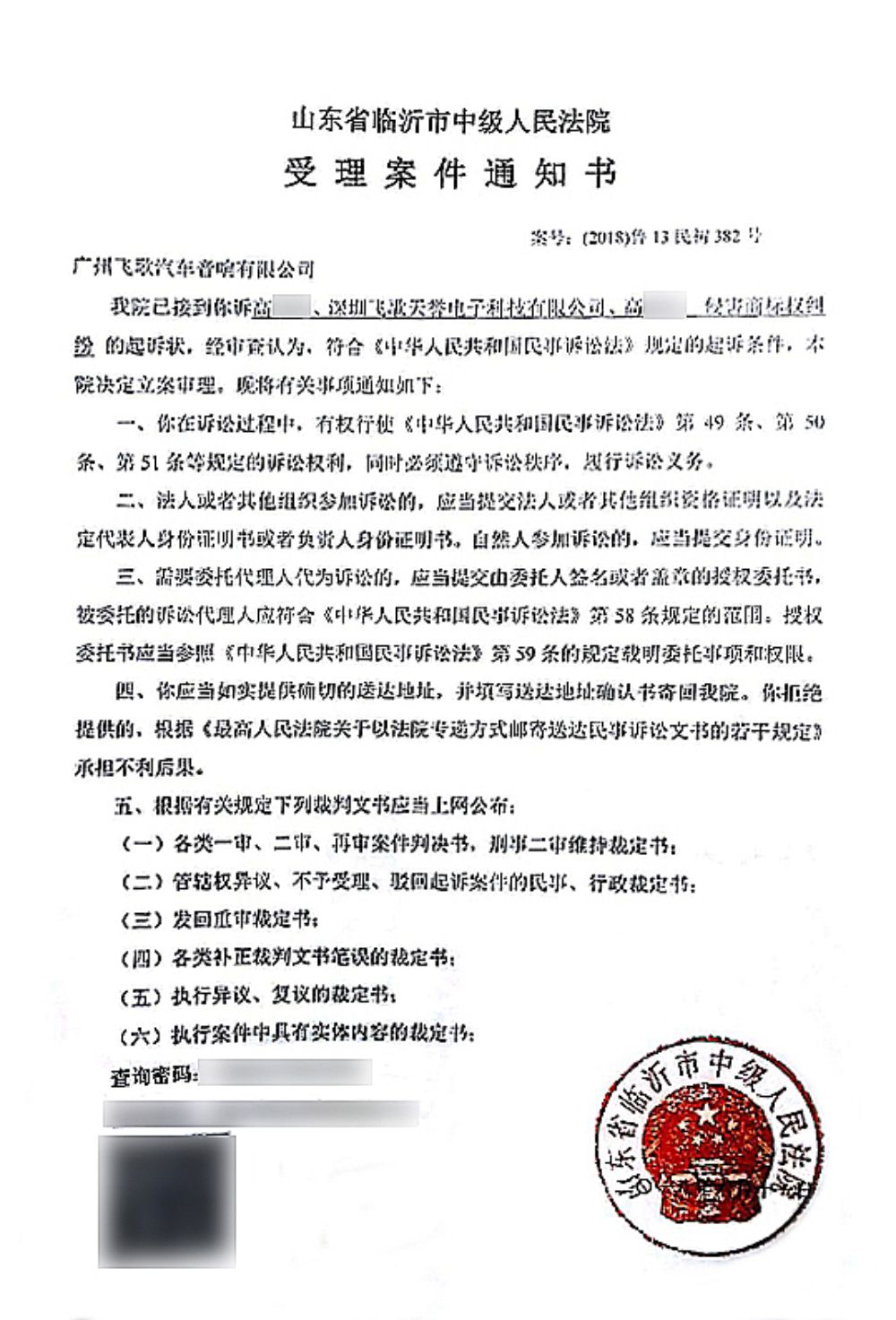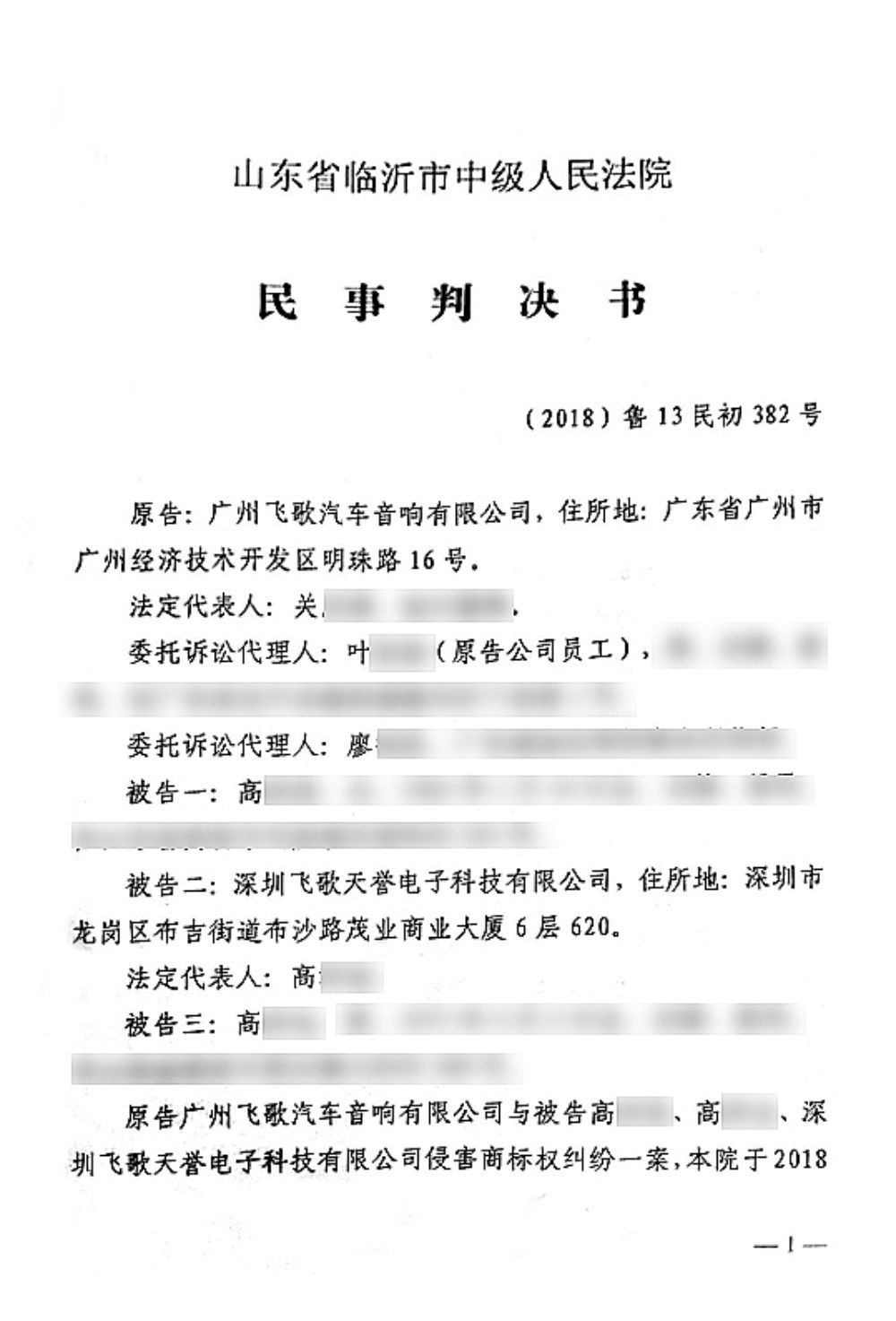 对此,我司已提出警告并于 2018年6月在山东省临沂市中级人民法院起诉相关不正当竞争方深圳飞歌天誉电子科技有限公司、高某某(女)及高某某(男)侵权行为,提出维权主张,并于近日正式审理终结。